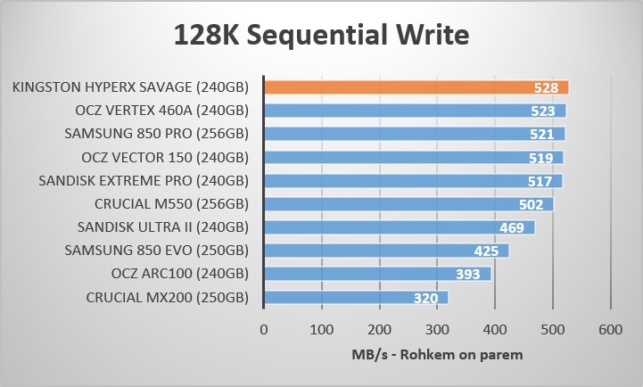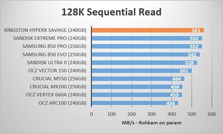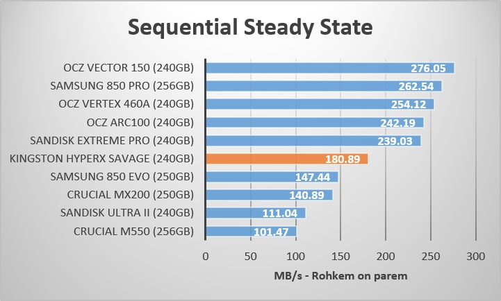 Kingston HyperX Savage 240GB pakub erakordset järjestikust lugemise kiirust. Ketas ei ole ülekoormatud käskudega, mis peaksid liikuma mööda SATA ühendust, võrreldes teiste testis osalenud seadetega. Phison S10 kontroller on sellel alal väga võimas ning sarnast võimsust võib kohata ka Corsairi Neutron XT ja Patriot Ignite seadete puhul. Muidugi ei saa mainimata jätta ka Phisoni eelmise põlvkonna kontrollerit S8, mis on selles valdkonnas sammuti tipptasemel ja kõrgelt hinnatud.