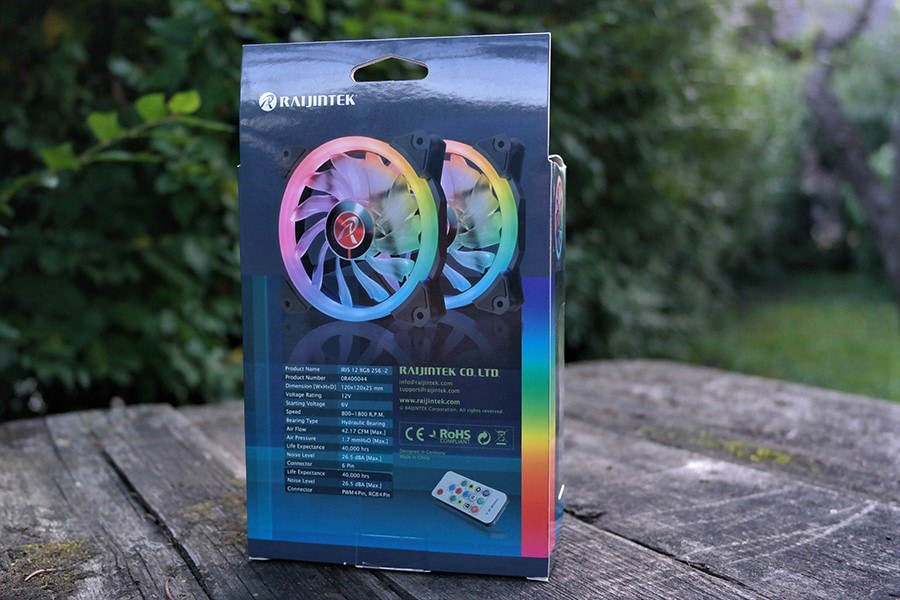 Pakendi tagaosal on detailselt välja toodud ventilaatorite andmed, pilt puldist ning Logod märkimaks, et tegemist on taaskasutatava pakendiga, mis täidab RoHS direktiivi. Vähesed tootjad panevad rõhku keskkonna säästmisele, seega tore on näha, et RAIJINTEK sellega tegleb.