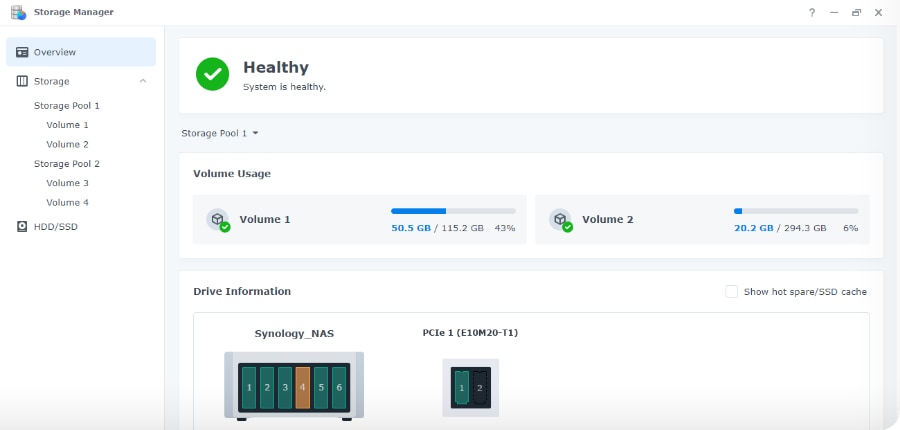DSM 7.0 on varustatud ümberkujundatud salvestushaldusfunktsioonidega, mis muudavad salvestusmahtude konfigureerimise ja kõvaketaste väljalülitamise lihtsamaks kui kunagi varem. Nüüd saab kergemini näha, kui palju andmeid nimetatud DSM-pakett kasutab. Tuvastada salvestuskogumis olevate draividega seotud probleeme. Lisaks on paranenud SSD vahemälu uute täiendustega.
