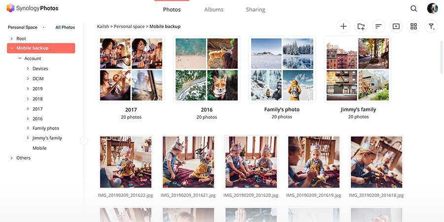 Luba mobiili varundamine ja sünkroonige kõik oma Android- või iOS-seadmes olevad pildid Synology NAS-iga. Vabasta oma seadmes ruumi sisu kaotamata. Sirvida fotosid liikvel olles, vaadatud fotod salvestatakse vahemällu ja neid saab sirvida isegi ilma Interneti-ühenduseta. Kanna pilte ja videoid oma telerisse AirPlay või Chromecasti kaudu.