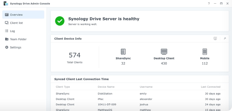 Synology Drive - võta oma failide üle kontroll ja loo failide sünkroonimiseks ja jagamiseks turvaline keskkond Synology veebipõhise failiserveri lahendusega. Uue Synology Drive'i administraatorikonsooli abil saab hoida kontrolli Synology Drive Serveri suuremate juurutuste üle. Jälgida serveri seisundit, kliendi seadme teavet, sünkroonimise olekut, väliselt jagatud faile ja kasutustrende.