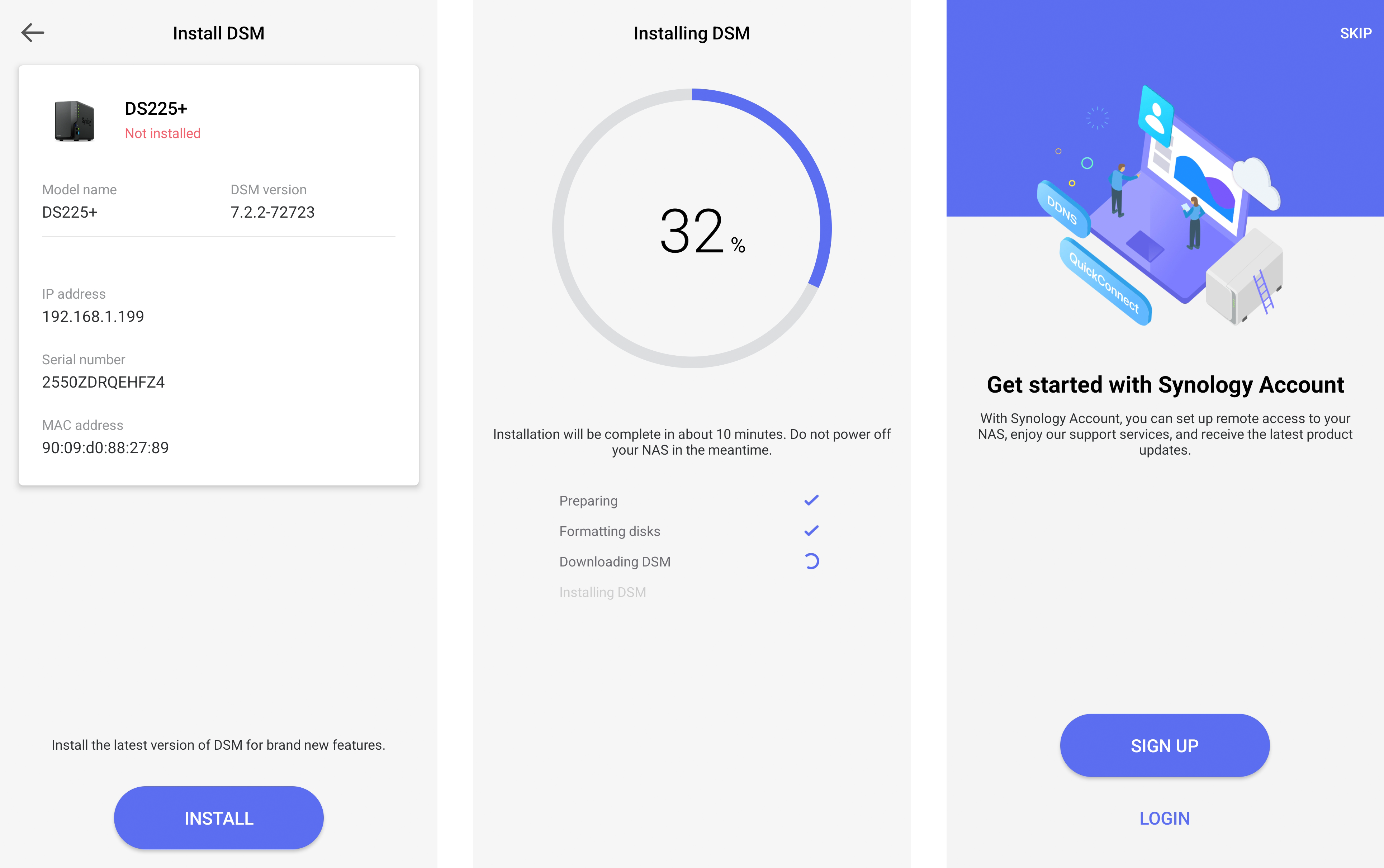 DSM (Synology DiskStation Manager) operatsioonisüsteemi paigaldus toimub veebiliidese kaudu ning kogu protsess on üles ehitatud loogiliselt ja arusaadavalt. Mõne minutiga on võimalik jõuda töökeskkonnani, kus saab alustada kasutajate, jagatud kaustade ja teenuste seadistamist.
