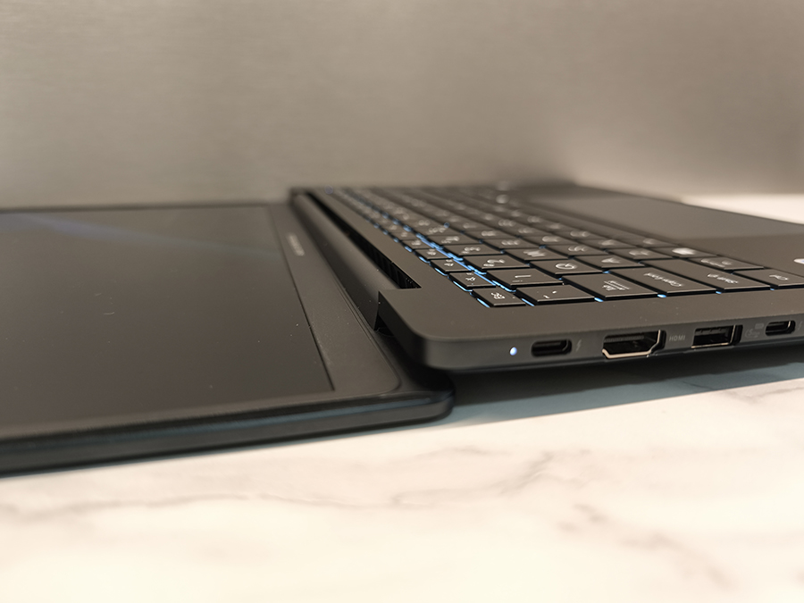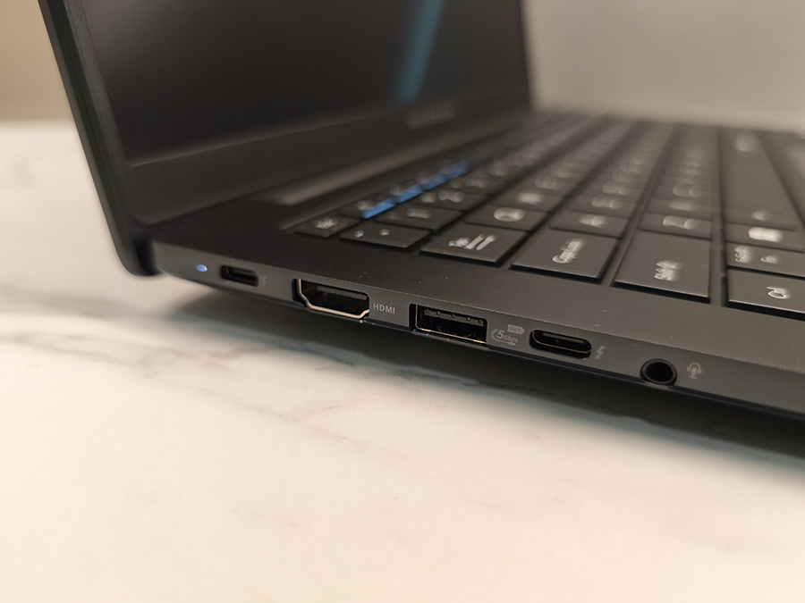 Vasakul küljel paikneb kaks Thunderbolt 4 (USB4) porti, mis toetavad nii ekraanipildi edastust kui ka laadimist (Power Delivery). Lisaks on vasakul HDMI 2.1 TMDS väljund välise monitori või projektori jaoks, üks USB 3.2 Gen 1 Type-A port ning 3,5 mm kombineeritud helipesa.