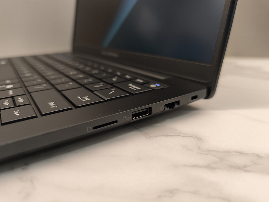 Paremal küljel on teine USB 3.2 Gen 1 Type-A port, RJ45 gigabitine Etherneti pesa ning microSD kaardilugeja. Turvalisuse jaoks on korpusel ka Kensingtoni lukupesa.