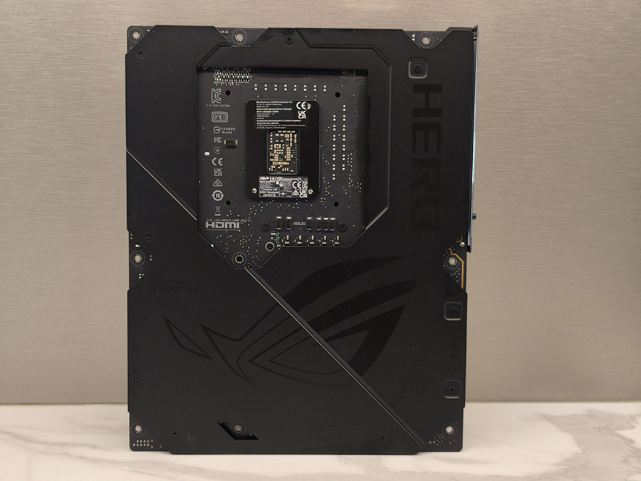 ASUS ROG Maximus Z890 Hero järgib ROG-le omast tööstuslikku ja agressiivset disaini – mati musta viimistluse ja RGB-valgustusega elementide kooslus jätab mulje kvaliteetsest ja jõulisest komponendist. Emaplaat on tagant toetatud täisulatiskulu kattega.