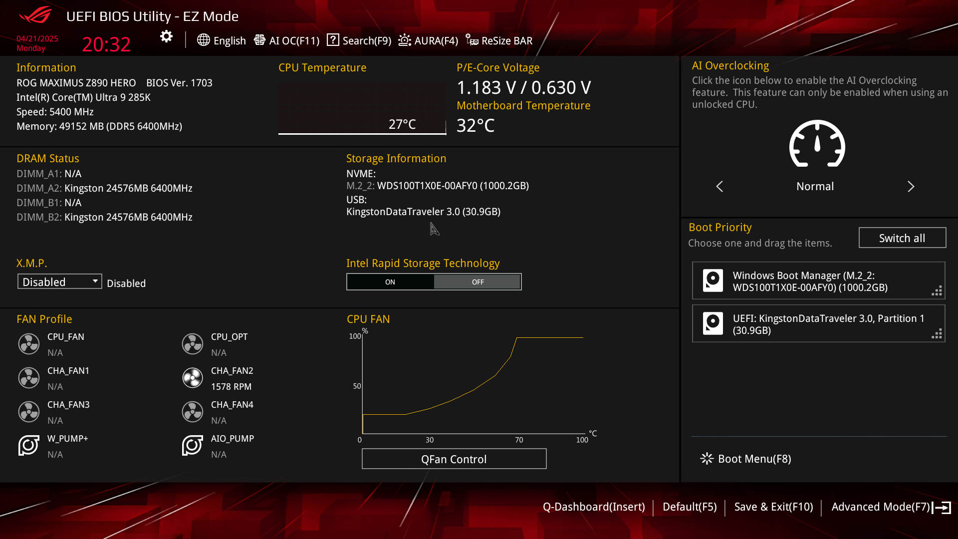 Koormustestide käigus säilitas ROG Maximus Z890 Hero suurepärased VRM-i ja kiibistiku temperatuurid, isegi pikaajalise ülekiirenduse korral. Täiskoormuse all püsis VRM-i keskmine temperatuur umbes 52 °C, ning kogu süsteemi temperatuurid jäid ohutusse vahemikku. Emaplaadi soojusvööndid ja ühendatud soojustorud tagavad stabiilse toiteedastuse ning vaikse töö ka maksimaalse koormuse ajal.