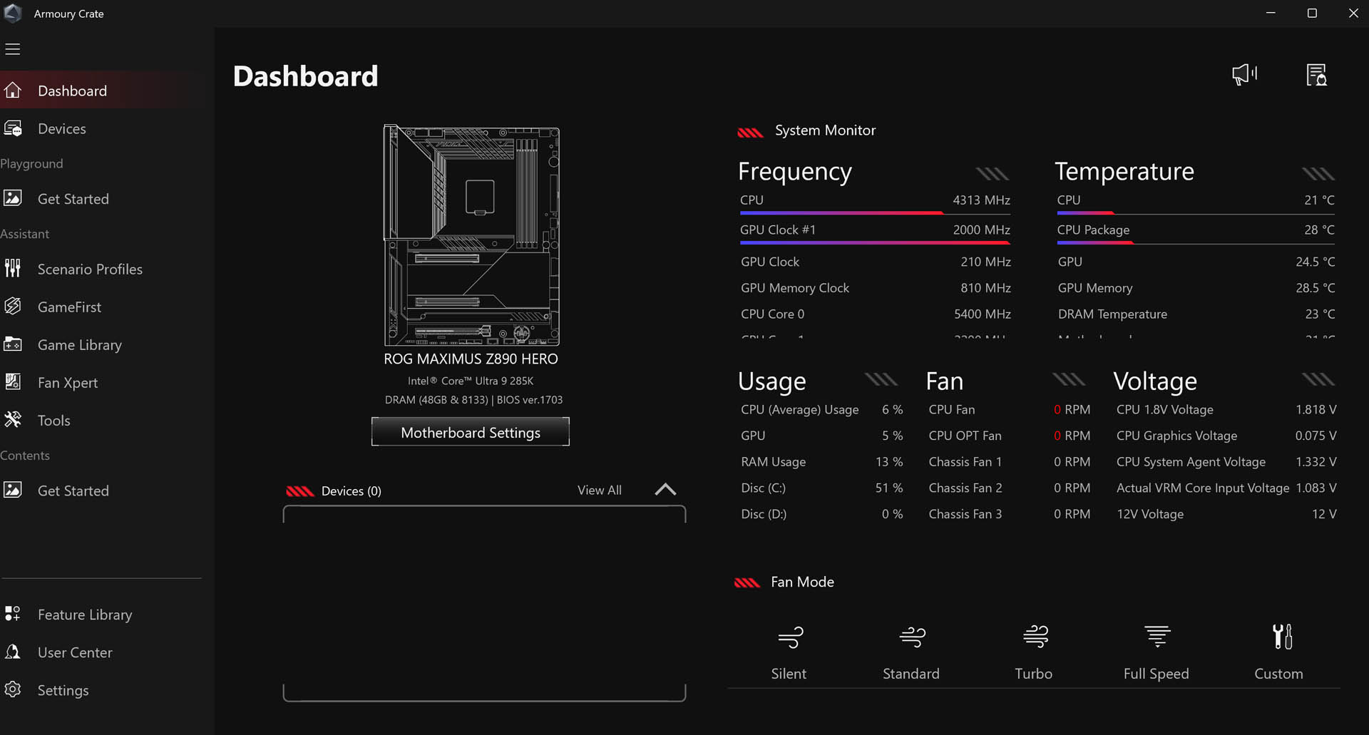 Armoury Crate ühendab süsteemimonitooringu, RGB-valguse juhtimise ja püsivara uuendused ühte keskkonda. BIOS-i uuendused on lihtsad tänu USB BIOS Flashback funktsioonile, ning erinevad profiilid (OC, Silent, Balanced) võimaldavad kasutajal vaevata vahetada töörežiime.