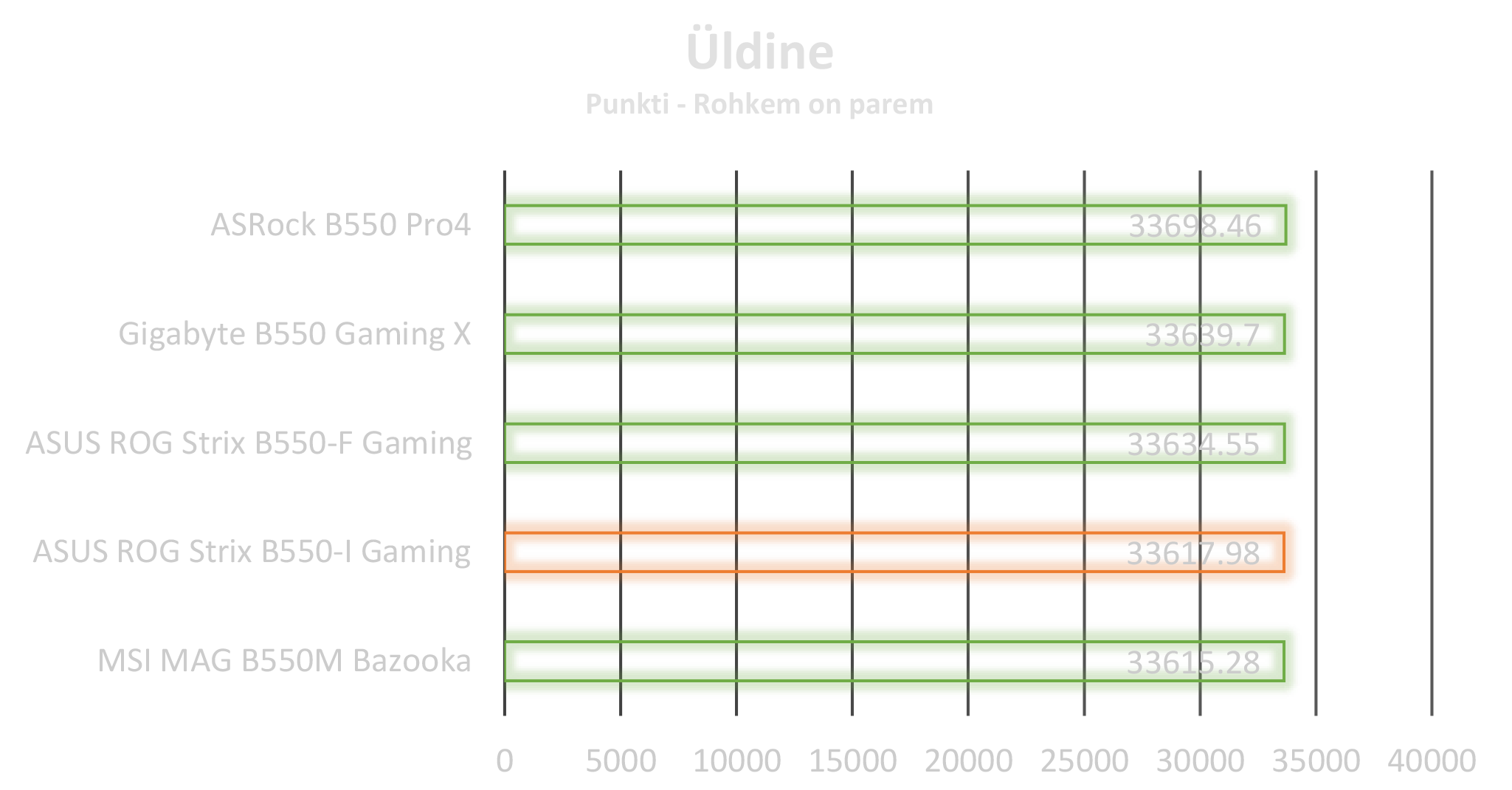 Testimine kulges stabiilselt ning ühtegi probleemi ega viga ei esinenud. Kuigi testikomplekti oleks võimalik veelgi laiendada, muutuks see ajamahukaks ning praktikas jäävad emaplaatidevahelised erinevused üsna väikesteks. Artikli lõpus olev kokkuvõttev diagramm annab kiire ja visuaalse ülevaate erinevate lahenduste suhtelisest jõudlusest, kuigi tegemist ei ole absoluutse täpsusega mõõdikuga.