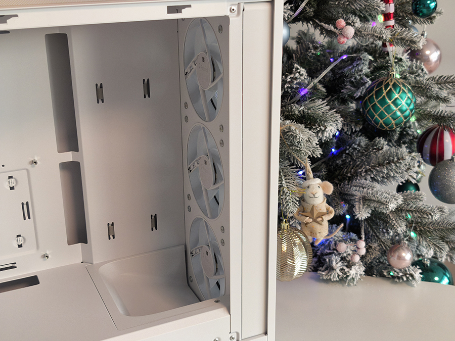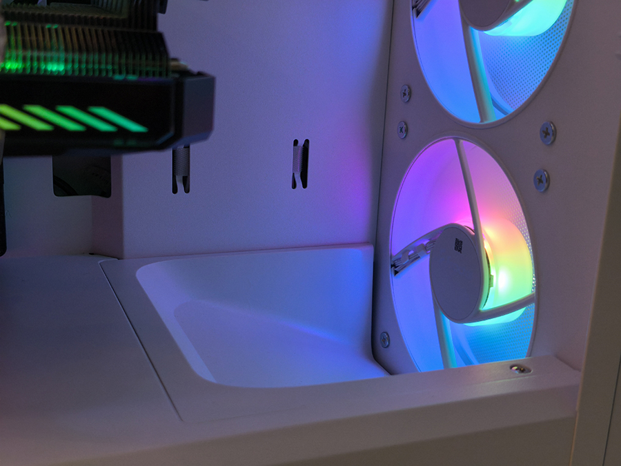 Ventilaatorite tugi on paindlik, kuid mitte liialdatud. Korpus võimaldab mitmesuguseid 120 mm ja 140 mm ventilaatorikonfiguratsioone ning toetab kuni 360 mm radiaatoreid ülaosas.