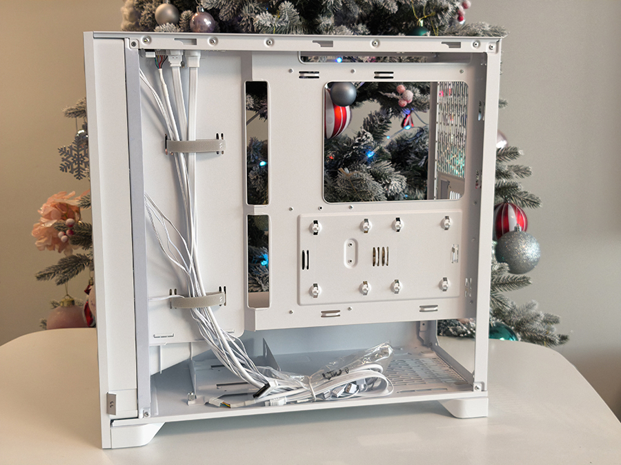Kaablite paigutamiseks emaplaadi taga on piisavalt ruumi ka paksemate toitekaablite jaoks, ilma et külgpaneeli sulgemine muutuks probleemseks. Eraldi määratletud kaablikanal ja integreeritud takjaskinnitused lihtsustab süsteemide ehitamist veelgi. Kuigi kummist läbiviigud puuduvad, on kaabliavad loogiliselt paigutatud ega vähenda kasutusmugavust.