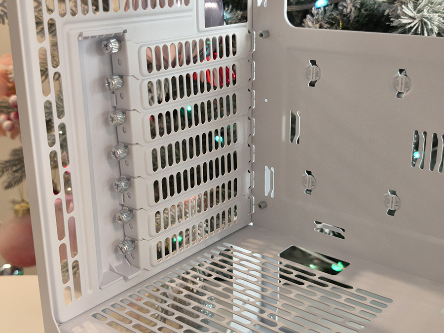 Salvestusseadmete paigutus on teadlikult tagasihoidlik. Korpuse sisemus seab esikohale õhuvoolu ja ehituse lihtsuse, mitte suure mahuga kettapesad. 3,5- ja 2,5-tolliste ketaste kinnituskohad on paigutatud nii, et need ei takistaks esiventilaatoritest tulevat õhuvoolu.
