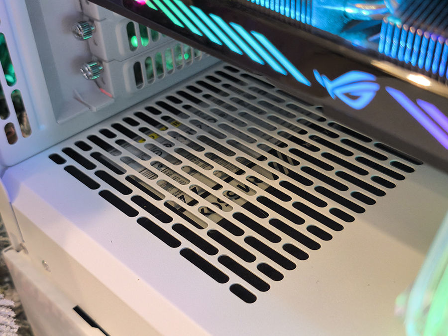 Selline disainivalik toob kaasa ka teise, puhtalt esteetilise kõrvalmõju. Kuna toiteploki õhuvõtuava jääb ventilatsiooniavade kaudu nähtavale, paistab põhikambrisse ka PSU tootja kleebis. Karastatud klaasiga külgpaneeli puhul rikub see mõnevõrra muidu puhta ja vaoshoitud sisekujunduse esmamuljet.